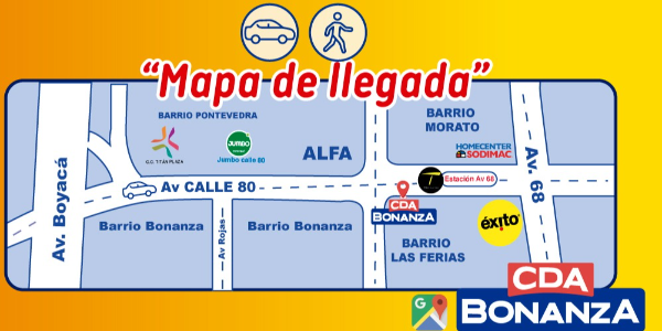 “Revisión Técnico Mecánica”, para autos y motos. – “Una revisión preventiva a cero pesos.  Forma de pago: crédito sistecredito, tarjeta Codensa, Daviplata, Nequi, VISA, MASTERCARD. Servicios complementarios de la CDA BONANZA “Peritaje para vehículos livianos”, servicio apoyado por nuestro aliado estratégico Elperito.com, que permite establecer el estado general de los vehículos a Gasolina y a Diesel. El costo de este servicio dependerá de que tanto desea conocer el estado del vehiculó. Servicio “tucarro.com” quien es nuestro aliado estratégico, el costo del servicio dependerán del tipo publicación contratada para el aviso clasificado.  CDA BONANZA: Av. calle 80 # 69B-49 Lunes a Viernes: 6:00 A.M a 10:00 P.M. Sábados: 06:00 a.m. a 06:00 p.m. Domingos y Festivos: 8:00 A.M. a 3:00 P.M Los servicios de peritaje y tucarro.com serán pagados por los interesados en el momento de tomarlos. Apoyo en la consecución del SOAT.